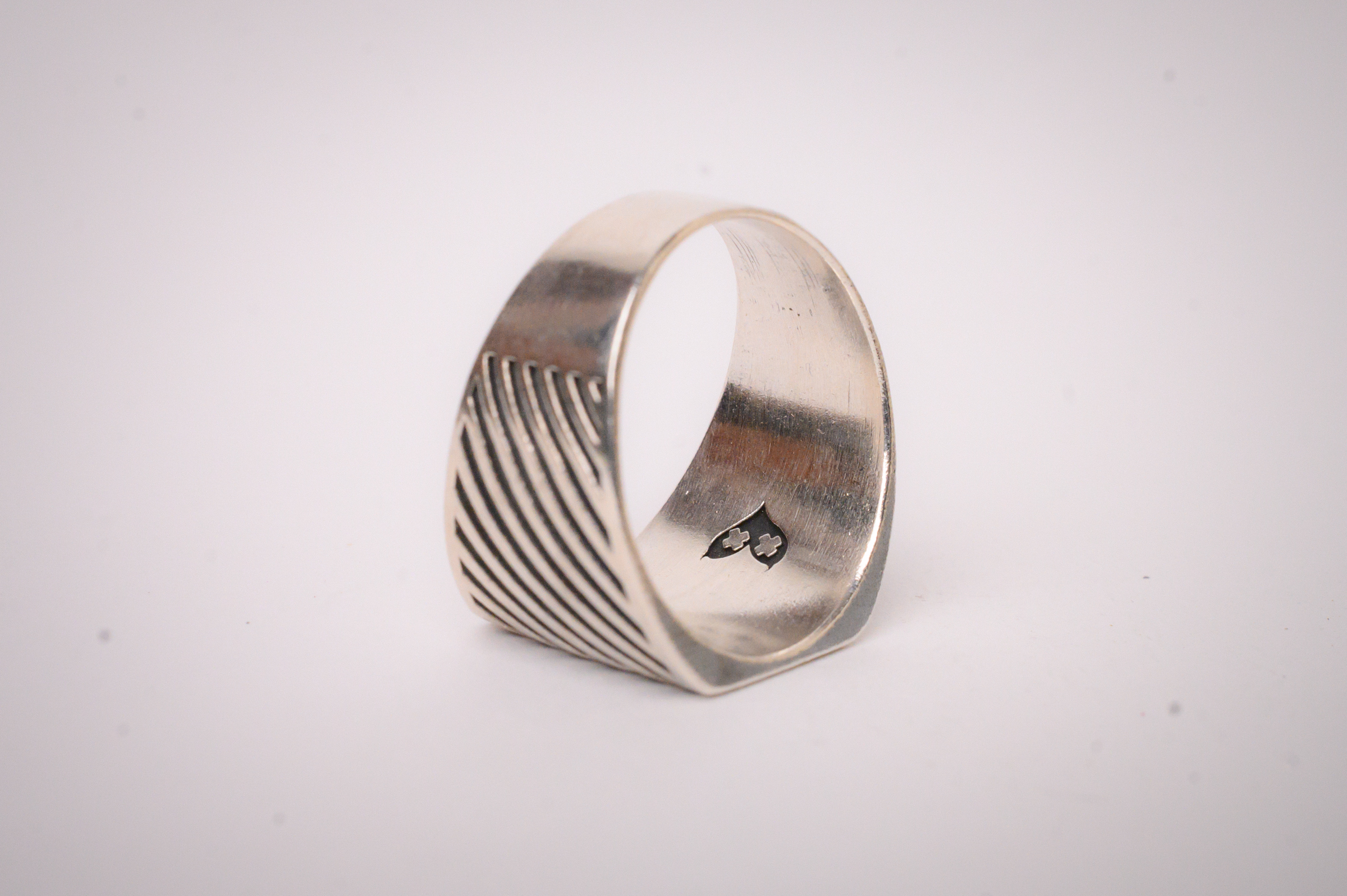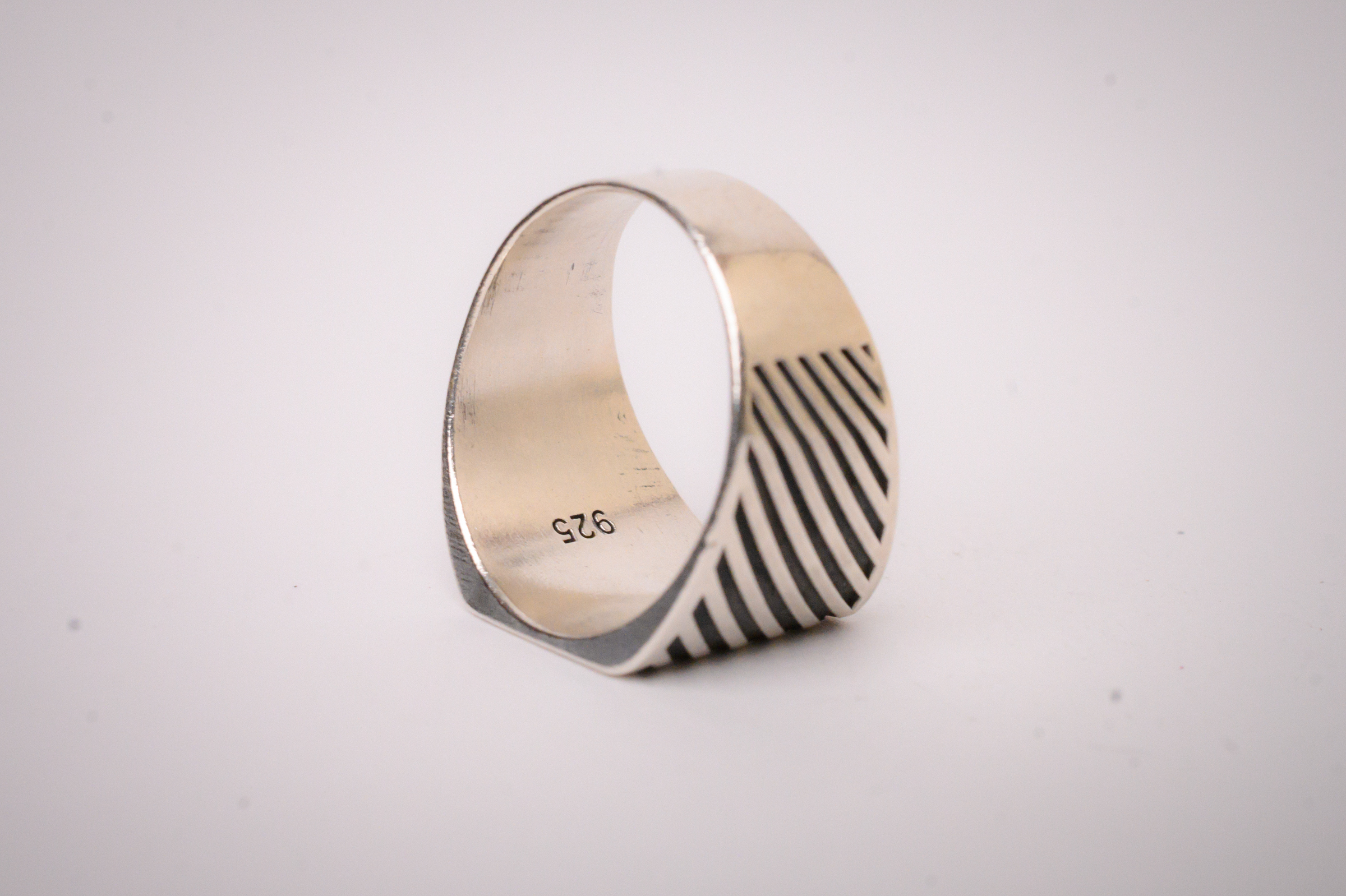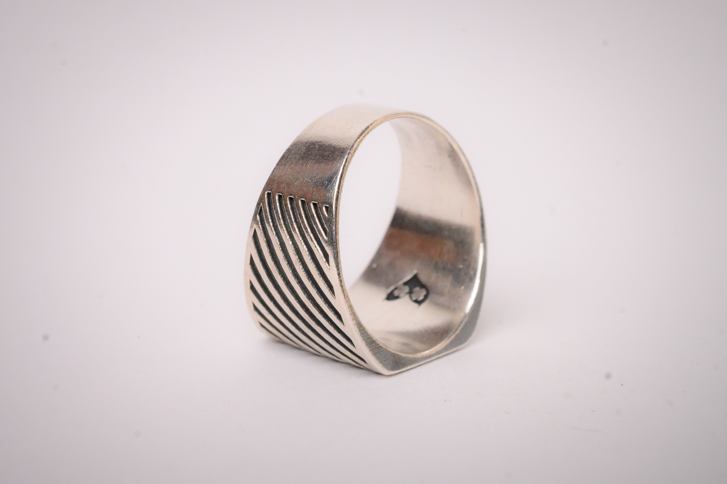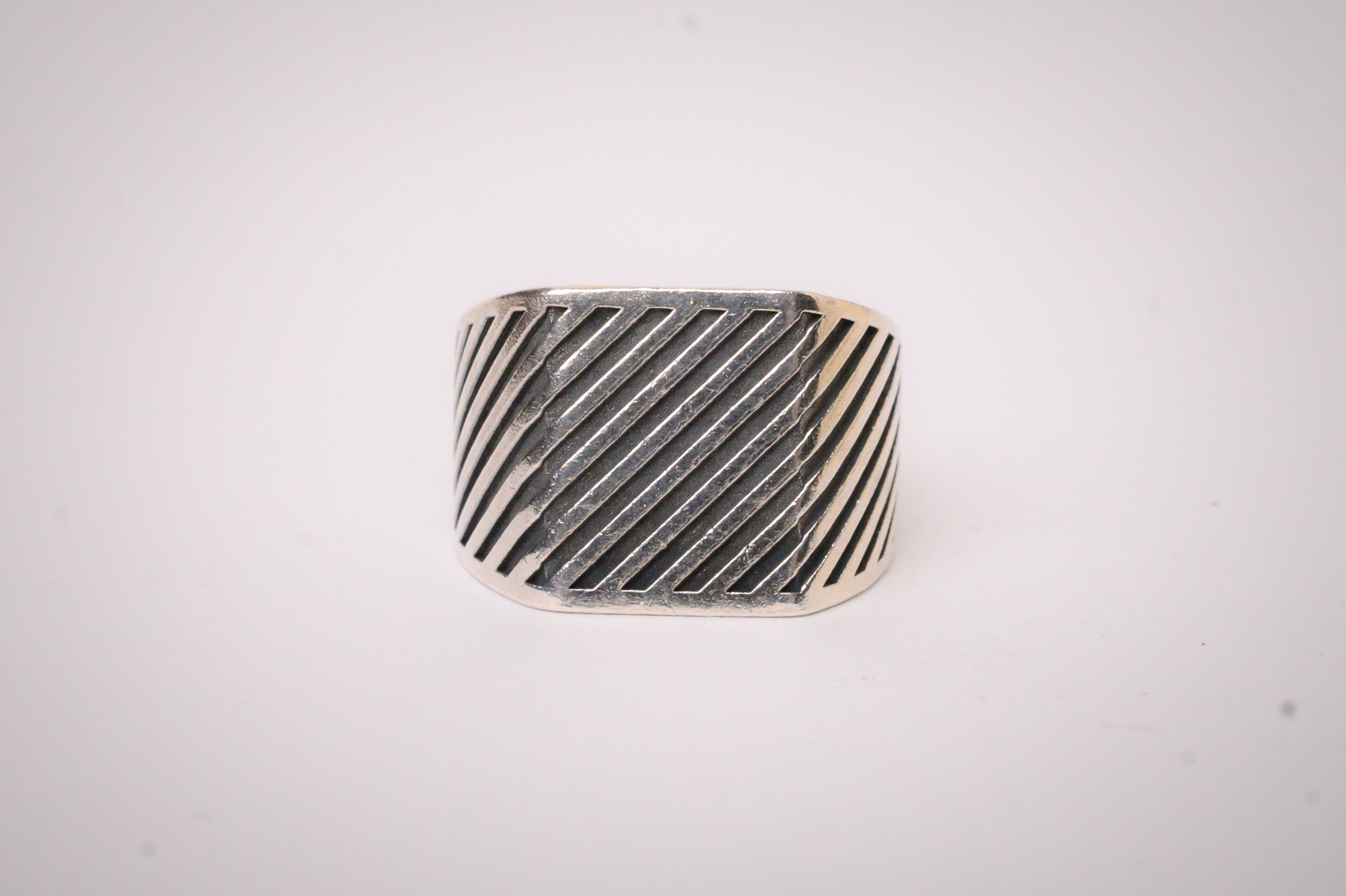 This sterling silver signet ring features recessed diagonal ridges that run across the surface, resulting in a bold face & a classy minimal finish.