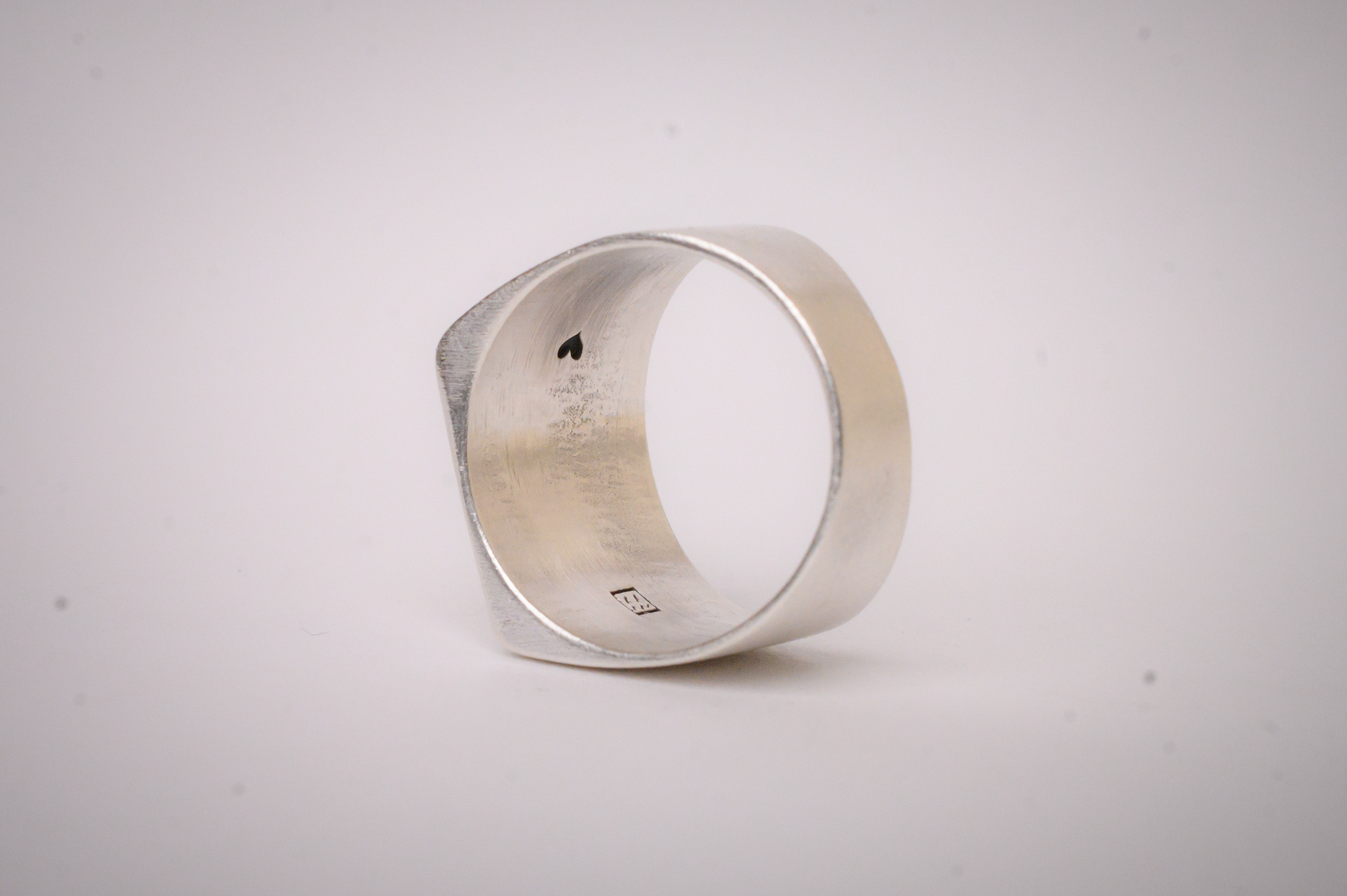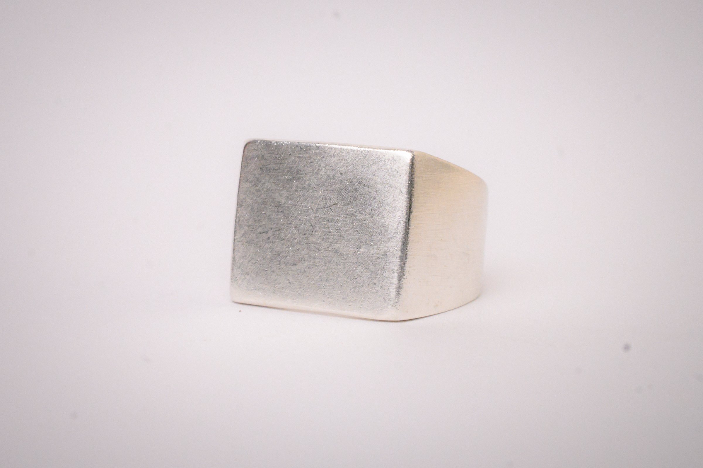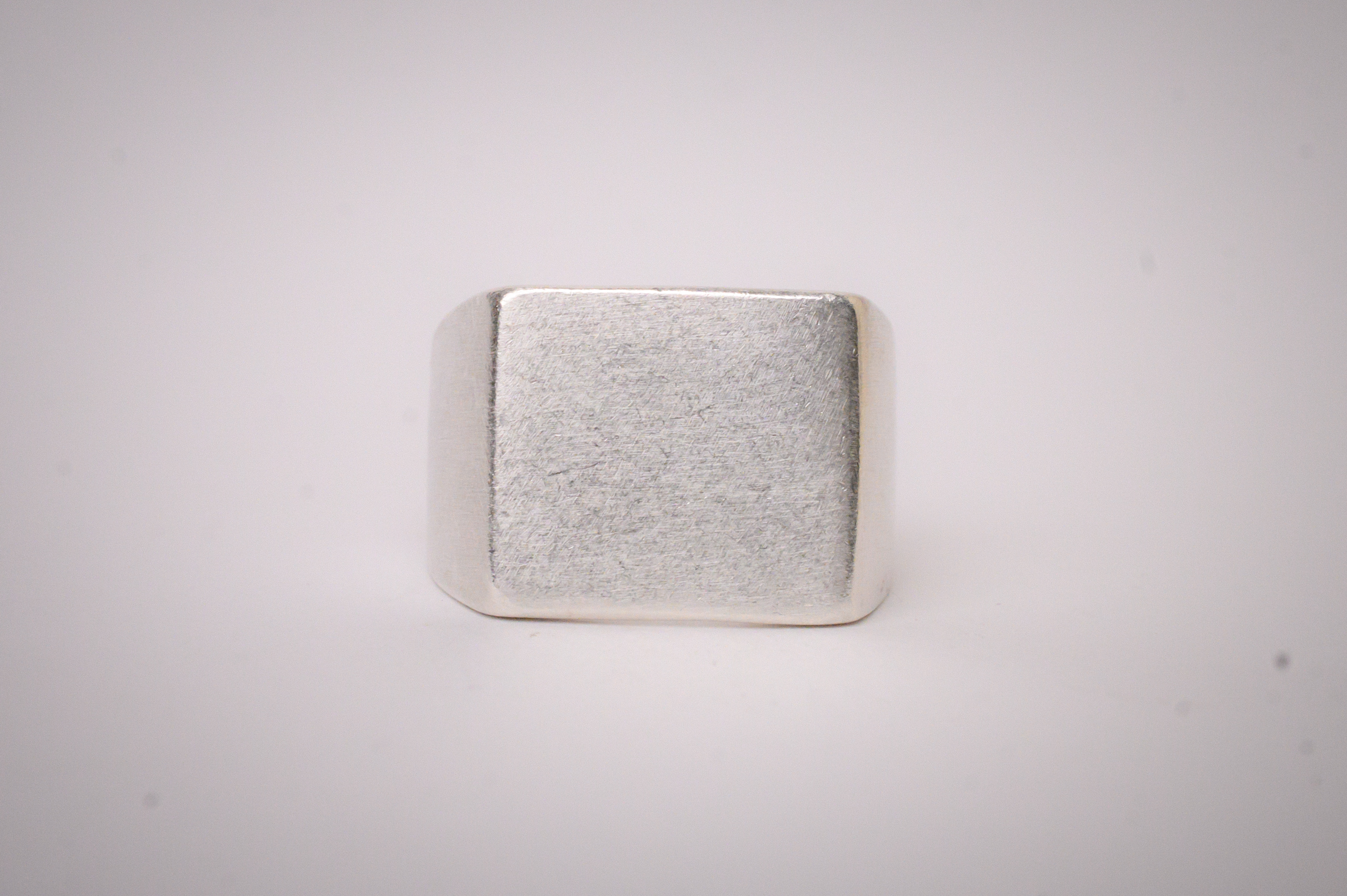 This minimalist sterling silver signet boasts a large blank face that will adopt the character of the life it lives.