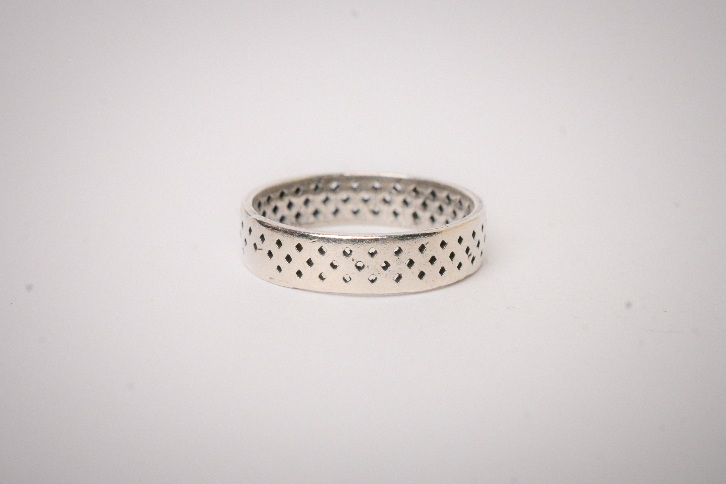 This narrow sterling silver band features a diamond patterned mesh that runs along its circumference.