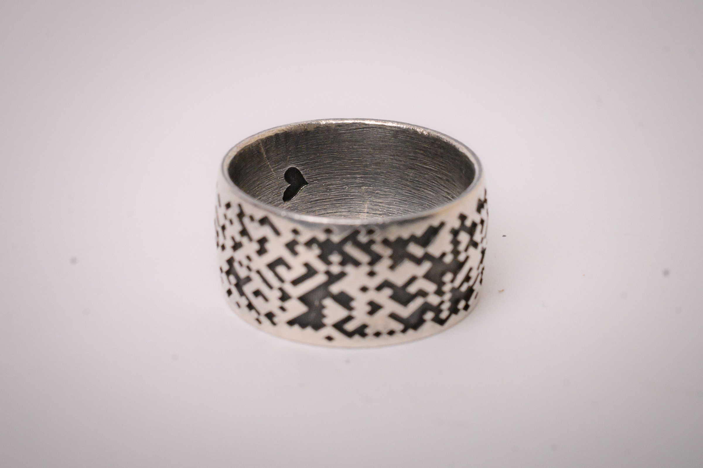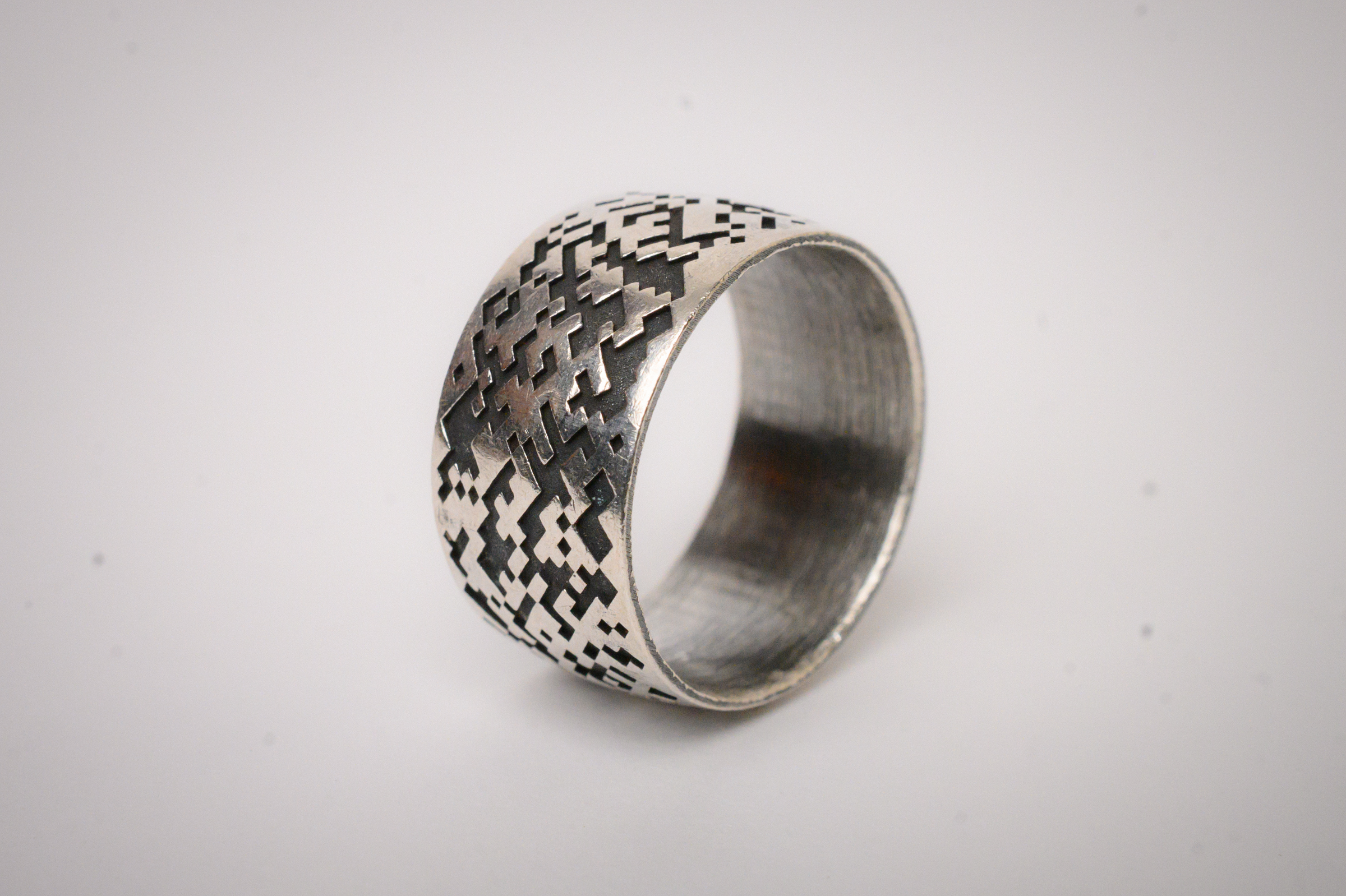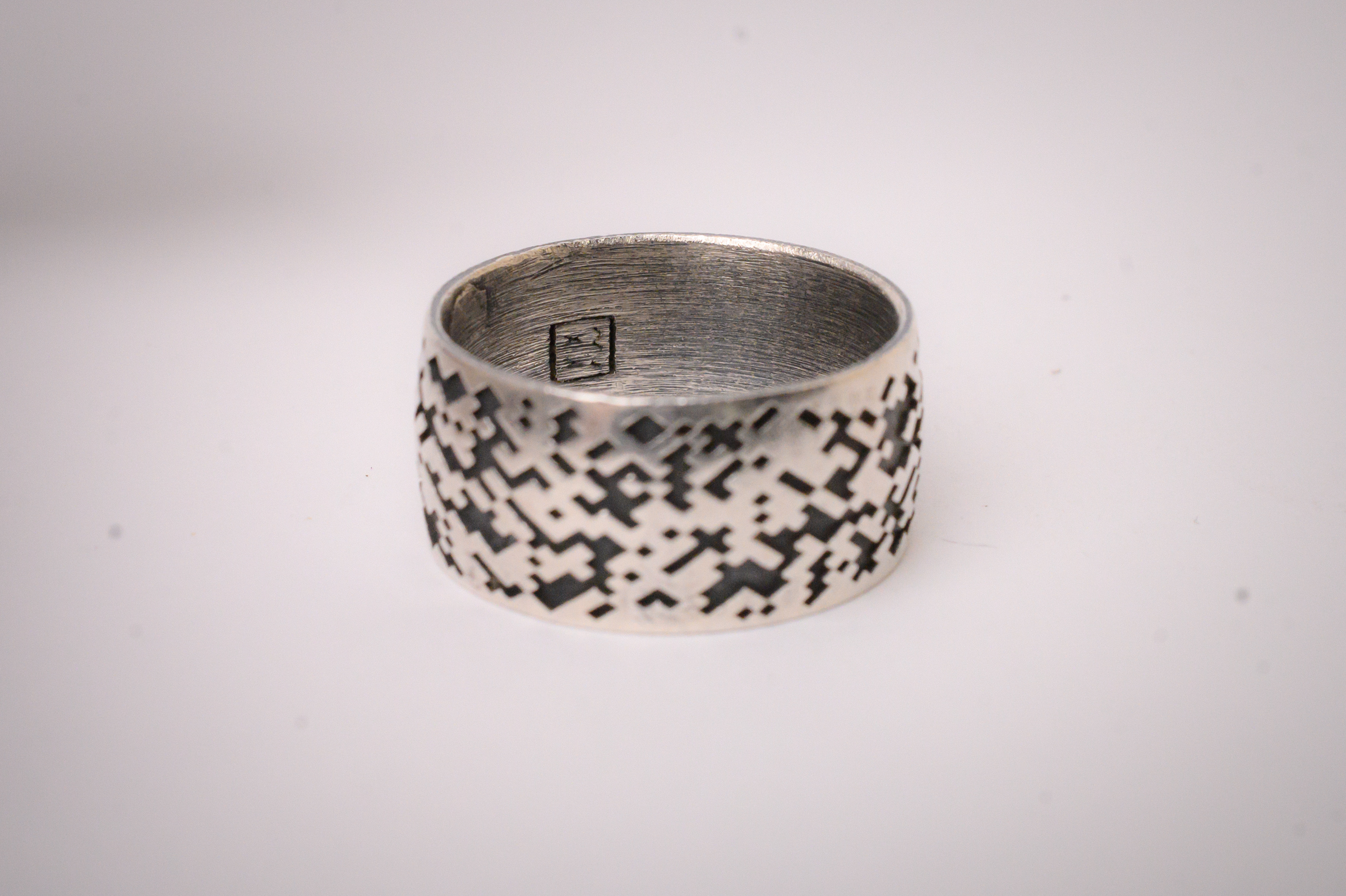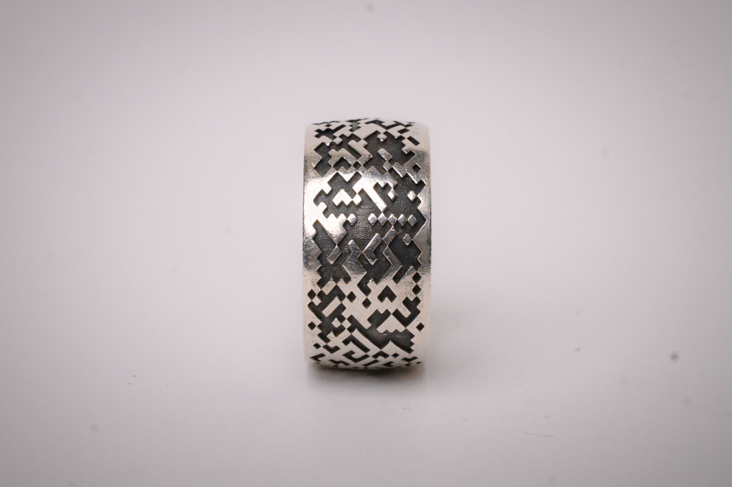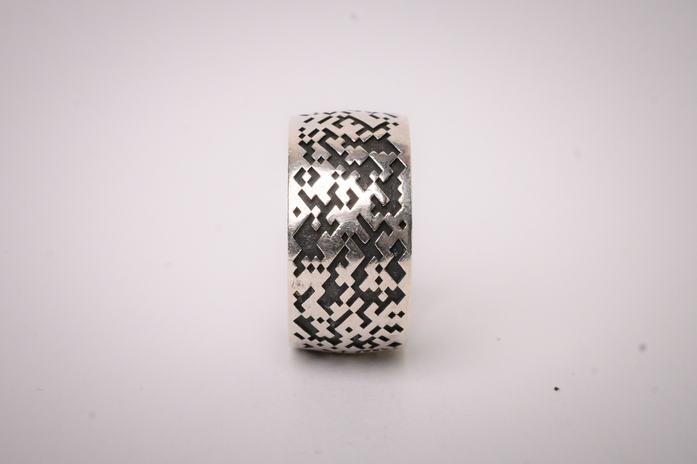 This wide format, sterling silver band features a digitized mosaic design that wraps around the circumference.