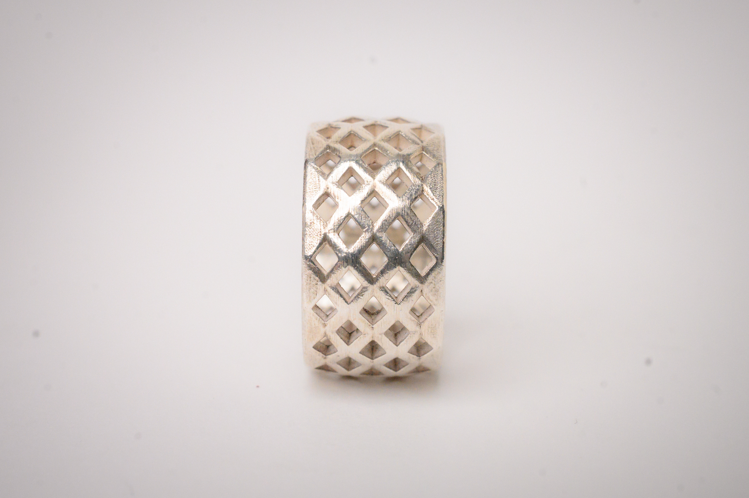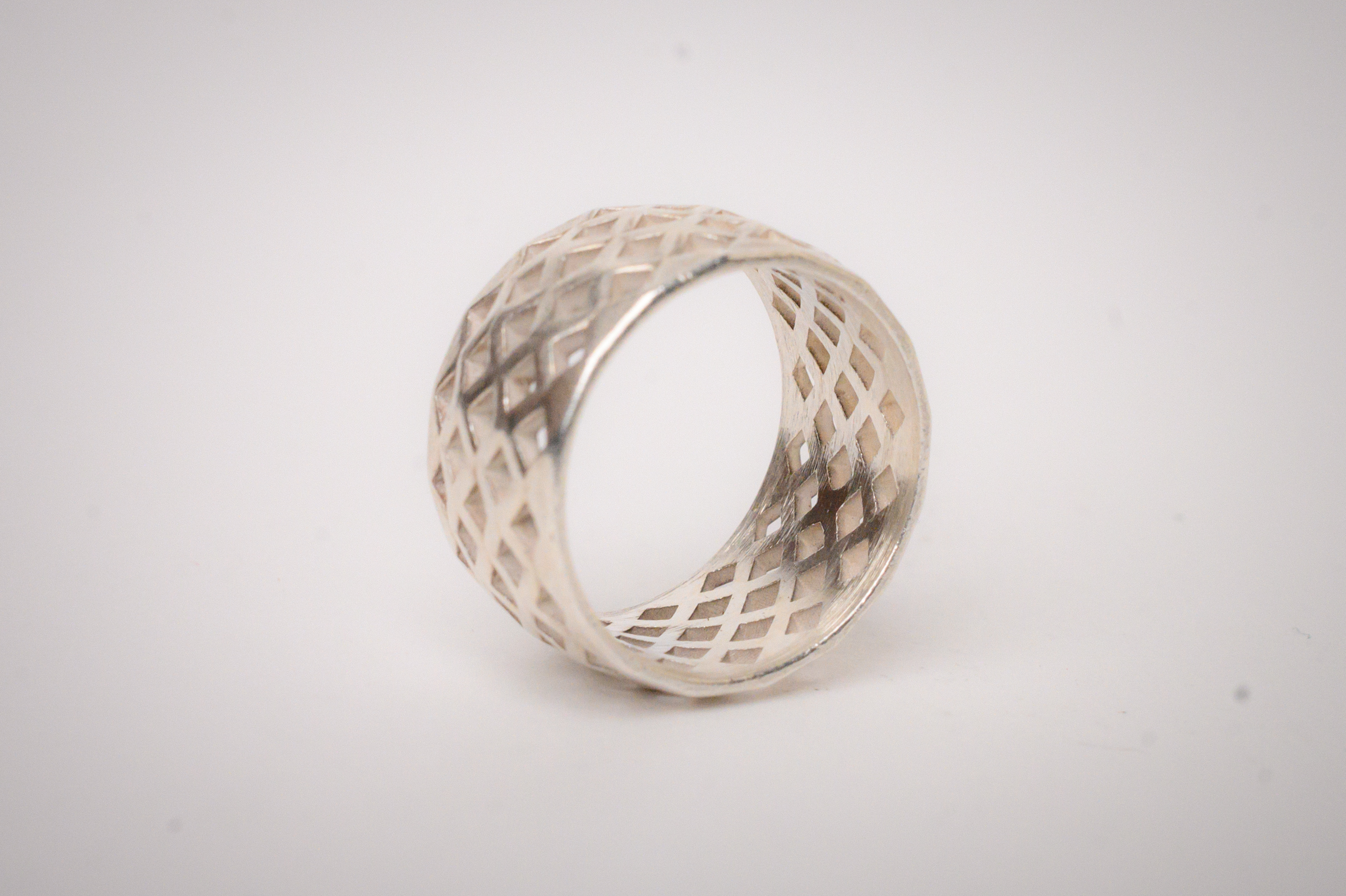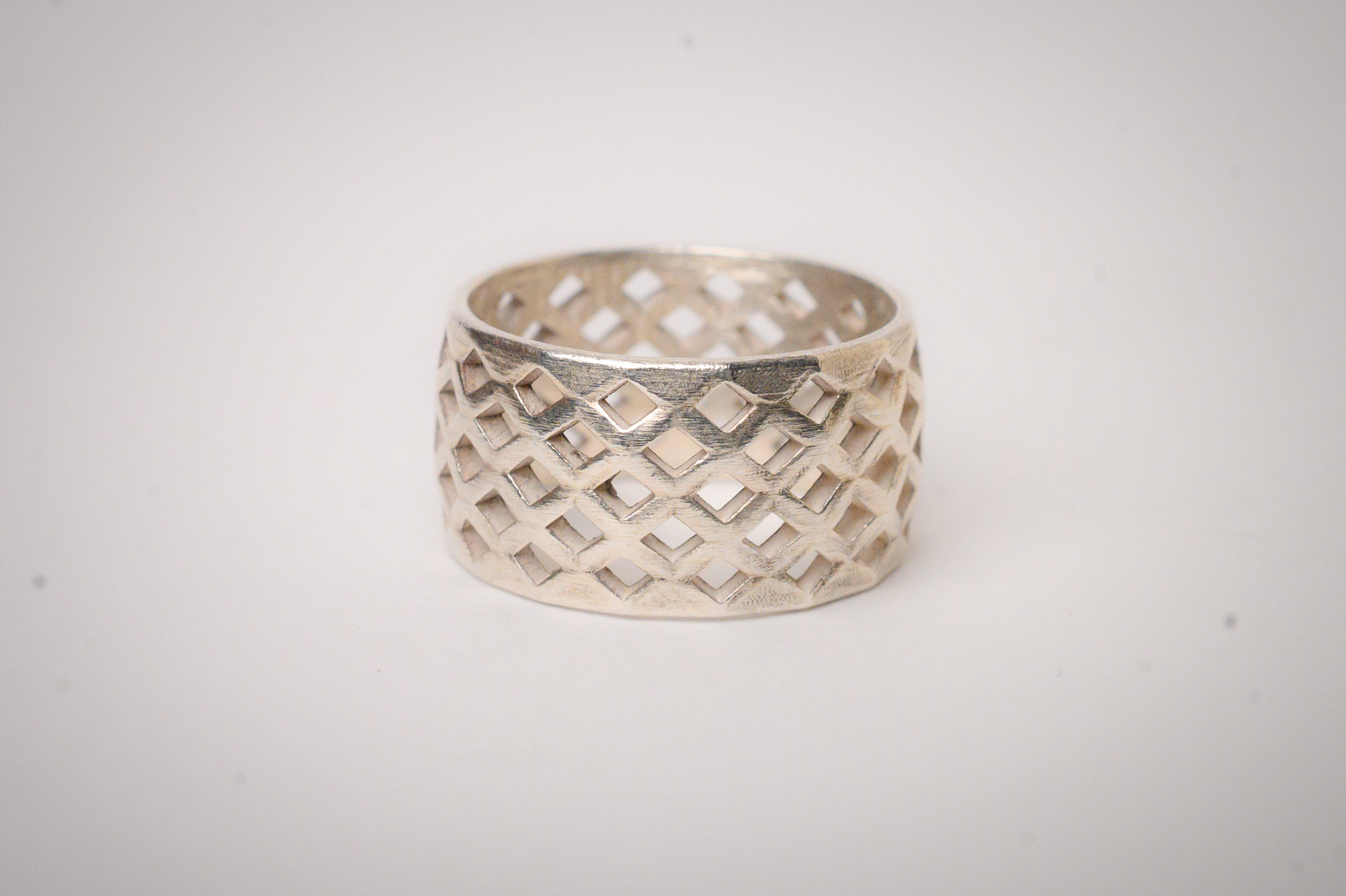 This wide format sterling silver band is comprised of an open diamond mesh.