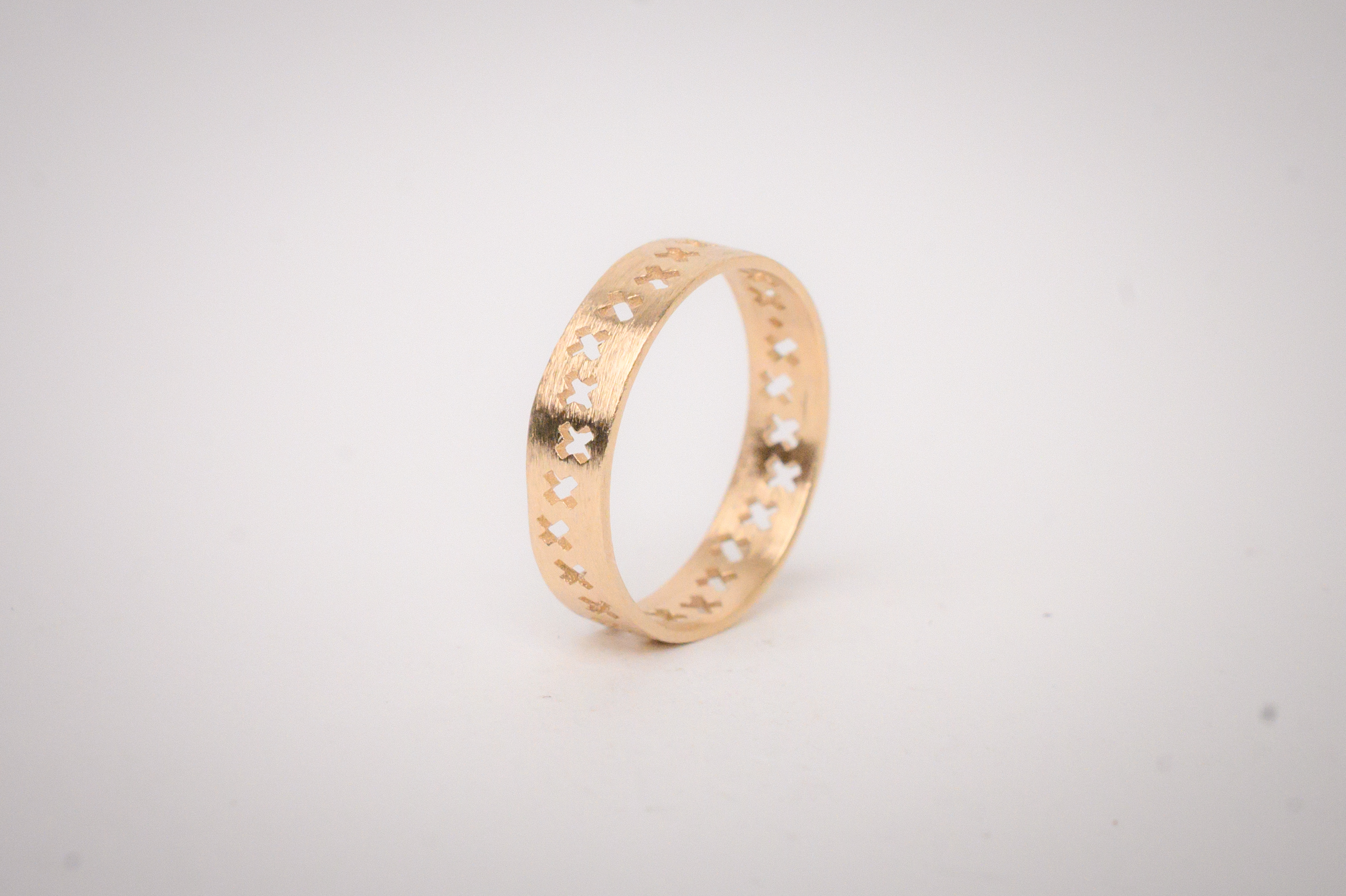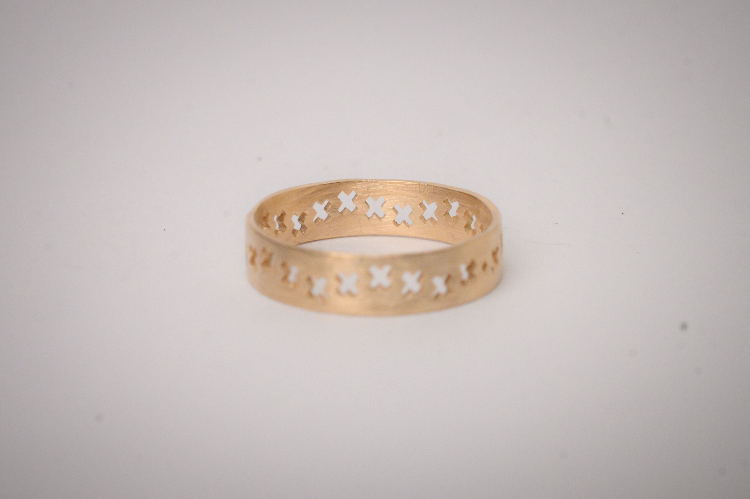 This narrow, 14k gold band features a series of X’s cut through its circumference.