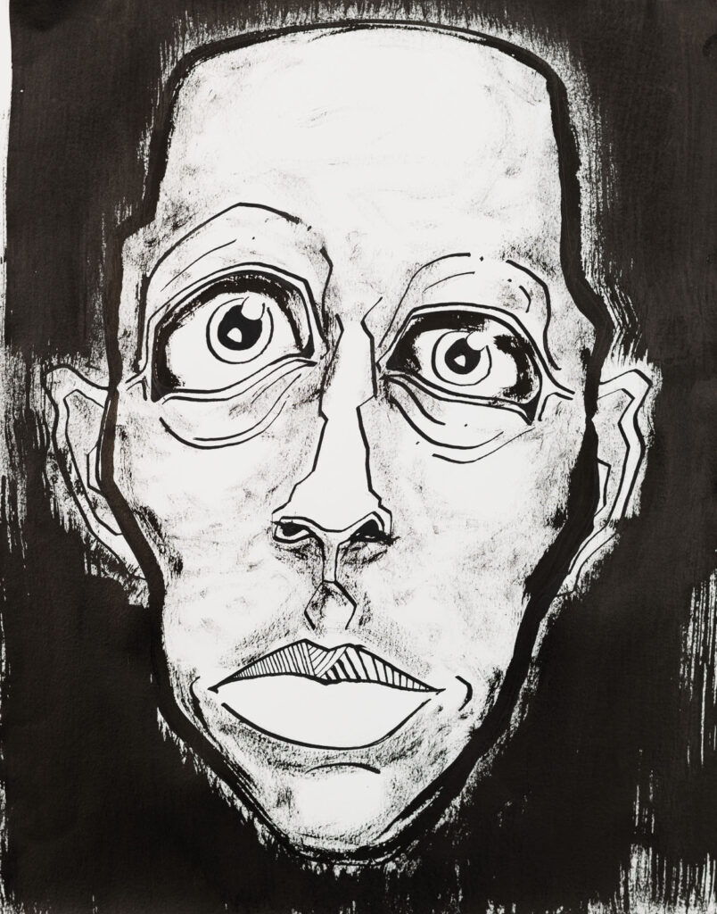 John works in Ink, Oil, Charcoal, & Acrylic mostly, on canvas and on paper.  Most of his work has celebrated a loose, dark, cold, portrait of ‘no one at all.’  The colors and strokes are often rough and chaotic, and whimsical.  Each face brings more questions about when and where a work is finished, and from which layers it derives its soul.